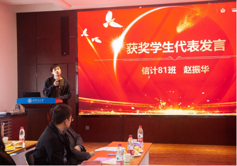 获奖学生代表赵振华同学分享了自己的获奖感受,在感谢数学系87级校友对他们学习和成长的关心和支持的同时,表示奖助金是对他们学习的一种激励和鼓舞,这种无私奉献的精神让他们感受到来自学校的温情和社会的关爱。作为年轻一代的学子,定当不忘初心牢记使命,砥砺前行奋斗不止,在不远的将来努力成为各个领域的杰出栋梁之才。
