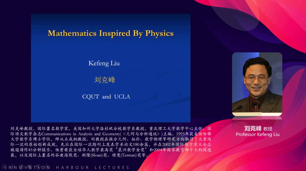 加州大学洛杉矶分校刘克峰教授作了题为“Mathematics Inspired by Physics”学术报告,从个人的学习和研究经历出发,介绍了数学与理论物理,特别是超弦理论的交融发展。