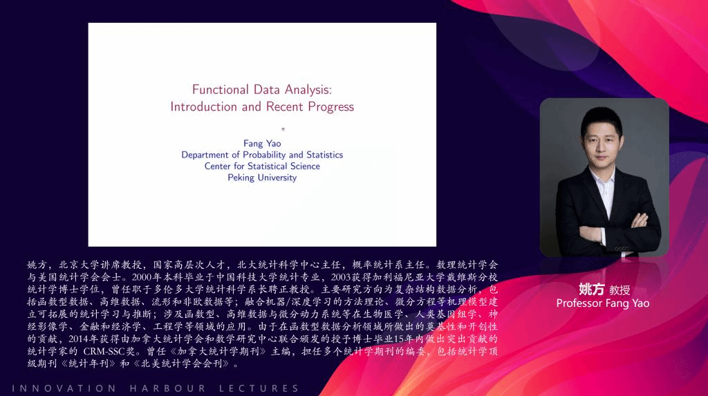 北京大学姚方教授作了题为“Overview and Outlook for Functional Data Analysis”学术报告,回顾与展望了函数型数据分析的重要问题以及相关应用。