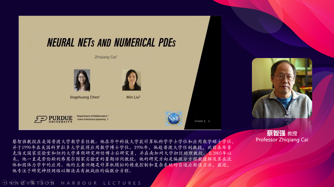 普渡大学蔡智强教授作了题为“Neural Nets and Numerical PDEs”学术报告,介绍了最近关于神经网络的工作及其在偏微分方程数值解中的应用。