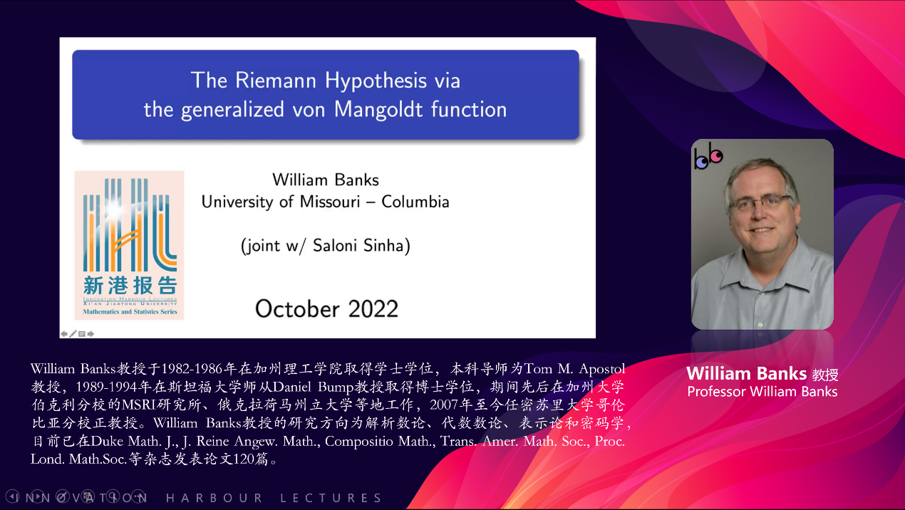 密苏里大学哥伦比亚分校William Banks教授作了题为“The Riemann Hypothesis via the generalized von Mangoldt function”学术报告,根据黎曼猜想可以被描述为一类von Mangoldt函数的求和问题的启发,分享了对广义von Mangoldt函数的研究。