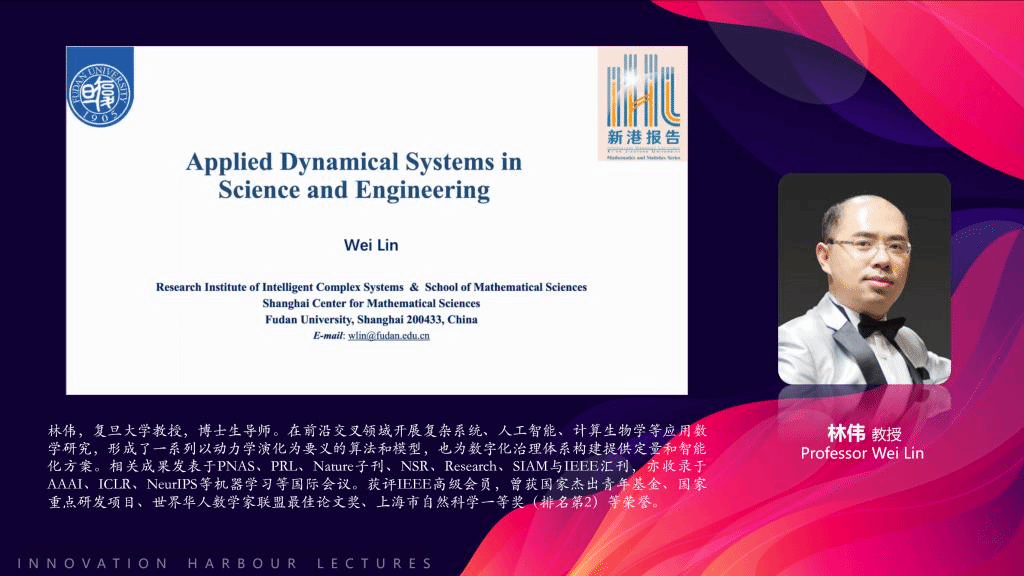 复旦大学林伟教授作了题为“Applied dynamical systems in science and engineering”学术报告,回顾了应用动力系统在各种科学和工程领域的经典进展,介绍了在大数据和人工智能时代应用动力系统所取得的最新进展。