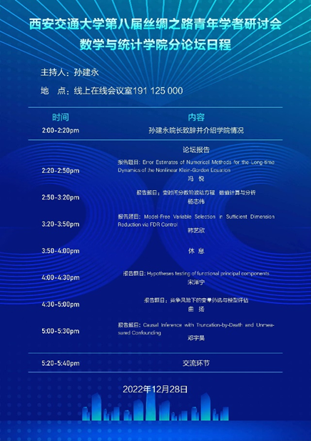 院长孙建永教授代表学院对六位青年学者参加此次数学分论坛表示热烈欢迎。对于暂时不能线下参会表示遗憾,并欢迎各位学者会后来交大线下交流。随后孙建永院长介绍了学校、学院的发展现状,以及数学和统计学科师资队伍建设等情况,并对青年才俊发出诚挚邀请,对他们加盟爱爱啦