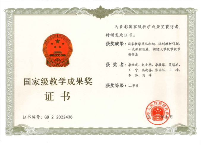 经过团队教师的不懈努力,高等数学、复变函数两门课程获得教育部办公厅颁布的第一批“国家精品资源共享课”;高等数学、线性代数与解析几何、概率论与数理统计、复变函数、数学竞赛选讲5门线上课程均入选首批“国家一流课程”;数学专业基础课程数学分析、高等代数与几何先后于2021年、2024年获批省级一流课程;5门国家线上一流课程为380余所高校的100万余学习者提供优质教育资源。