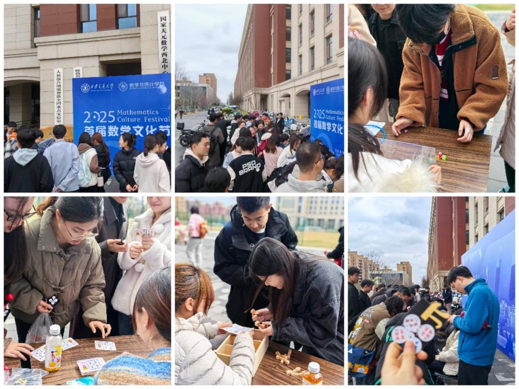在创新港校区与兴庆校区,学院同步推出“数学快乐π”嘉年华。有博弈论小游戏,浦丰投针实验、等价“结”的判定、圆周率估算、豆芽游戏、孔明锁、心算24点擂台赛、概率骰子大作战、方程套圈大赛,参与这些创意活动,让抽象数学理论变得“触手可及”,吸引了大量师生参与。志愿者同学们还设计了精美的文创礼物,师生们在欢乐中感受数学与艺术、生活的深度联结,现场洋溢着求知与乐趣交织的热烈氛围。