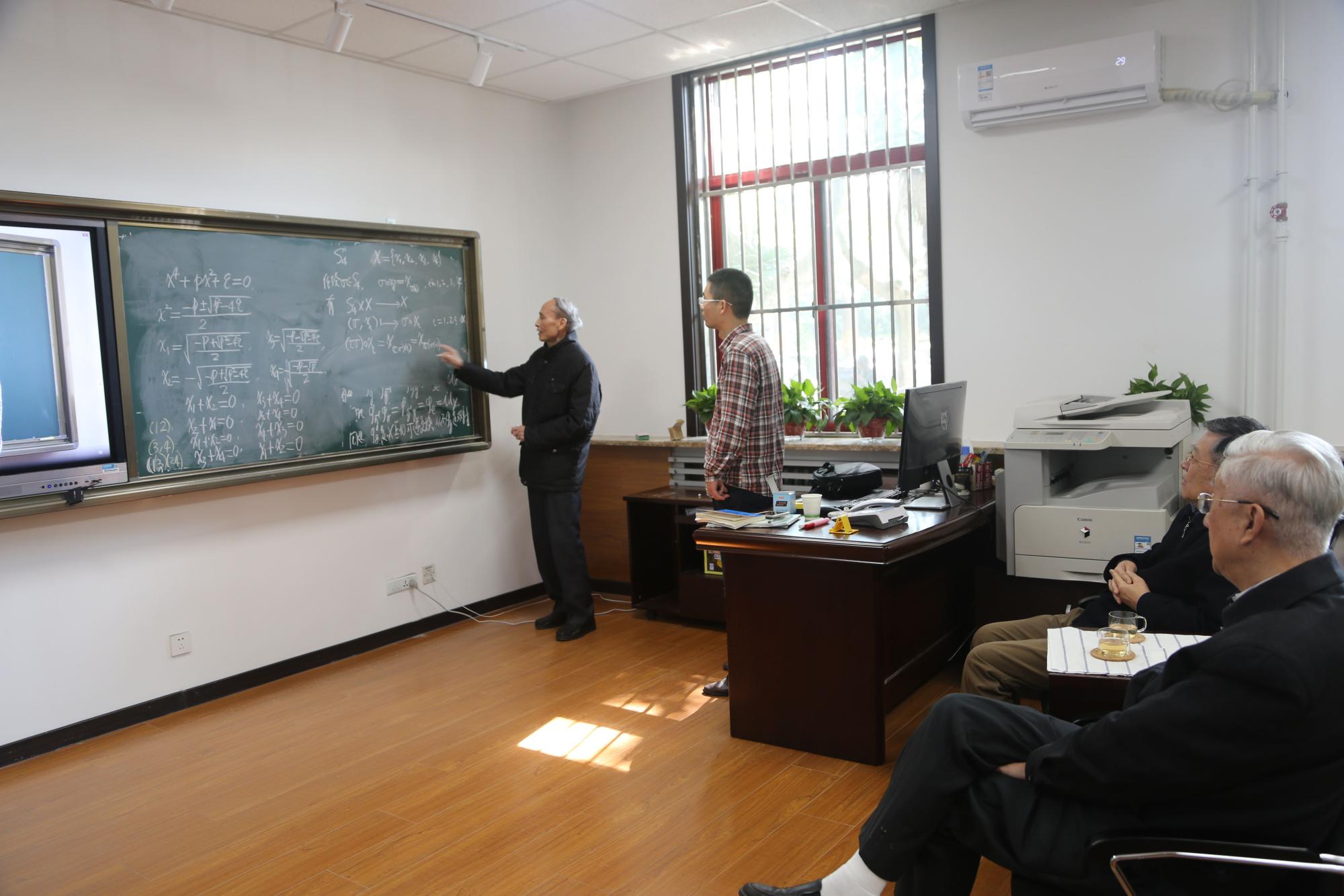 张强老师本次试讲内容是《近世代数》中的章节——群在集合上的作用,板书清晰、字迹漂亮、内容熟悉,受到了指导专家的肯定。试讲过程中,各位指导专家仔细分析了张强老师的授课过程,根据自身多年教学经验提出了“语速不要太快、逻辑要清晰”、“推导过程要详细”、“要从学生接受的角度来确定讲法”等诸多具体的意见。《近世代数》一书的作者丘维声教授特别亲自走上讲台,进行授课示范。