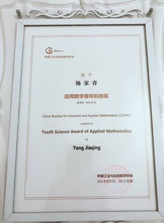 杨家青副教授因其在反散射领域所作出的贡献,荣获第四届“CSIAM应用数学青年科技奖”。