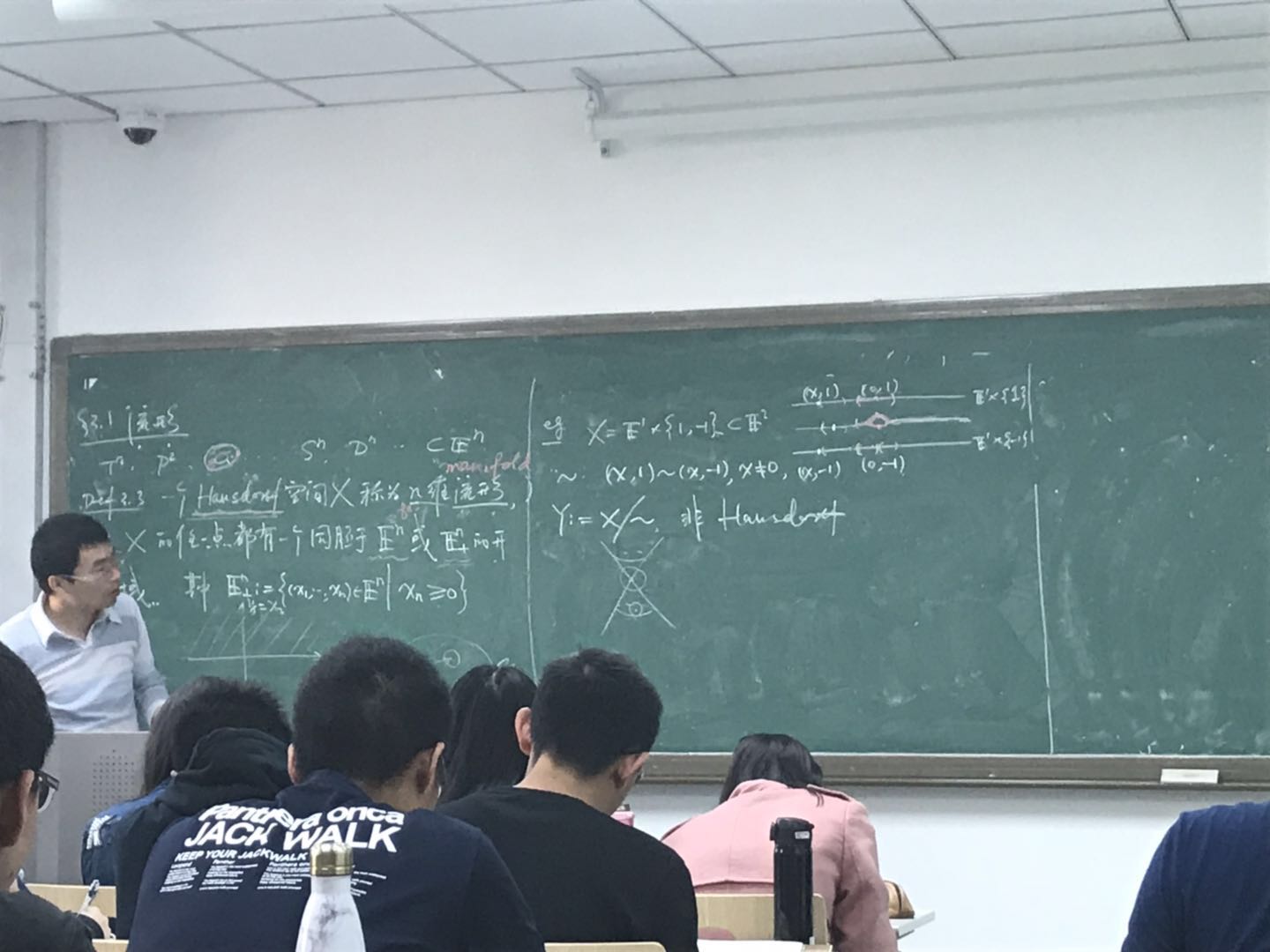 课堂上,张老师首先对商空间做了简单的回顾,之后为同学们举了4个例子。例如,将一条对径的平环拼接起来,就构成了之前课程中提到的莫比乌斯带。同时指出拓扑学作为几何学的分支,一定要先有足够完备的几何认识才能更好地认识拓扑学。