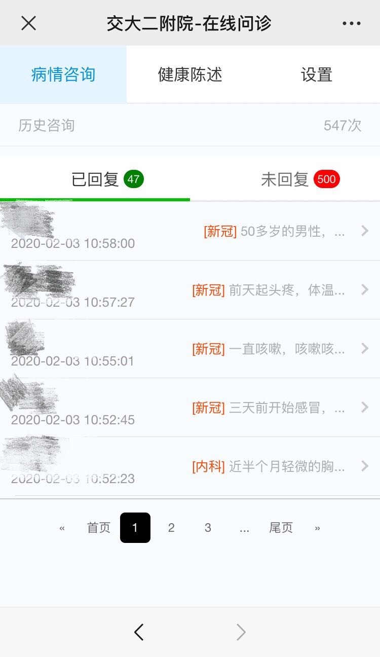 此系统是一款综合的医疗在线服务平台,统一了医生和病人的信息流转,打通了医疗环节中的各参与者、各系统、各终端,实现互联互通,促进信息数据充分流动,为患者提供疾病问诊、健康答疑、病情跟踪、实时监护等一站式医疗服务。平台已于2020年2月1日零时正式上线,截止2月3日24时,该系统已向5500余人次提供咨询、问诊及筛查服务。