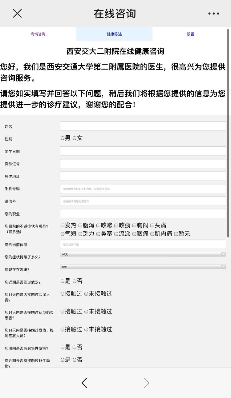 医学人工智能团队日前为西安交大第二附属医院紧急开发出一套免费在线健康咨询、问诊与新冠风险筛查系统。