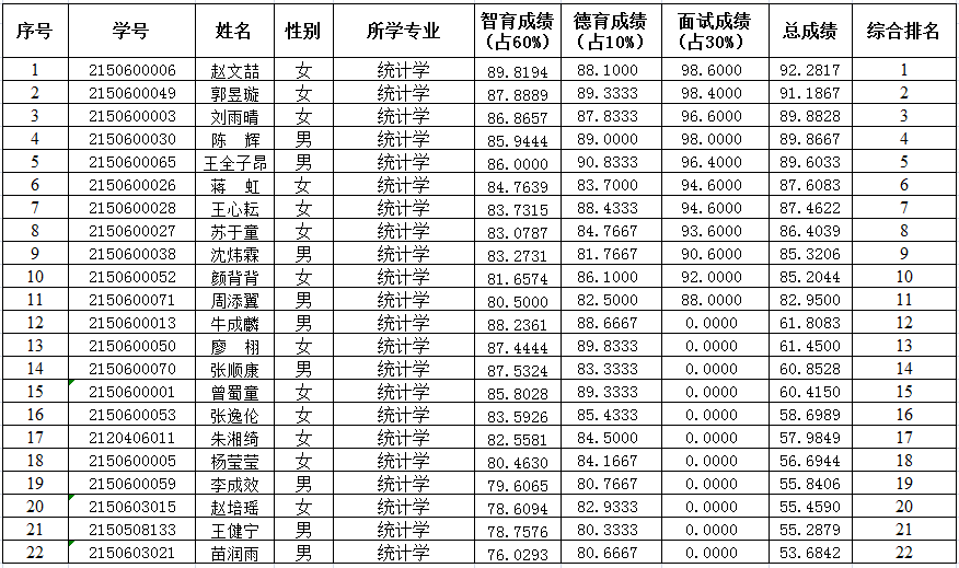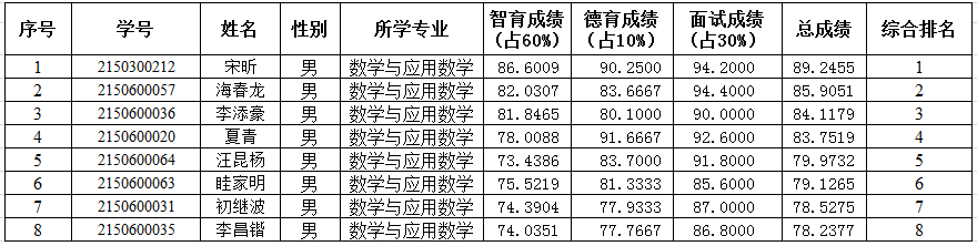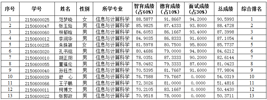 2019届爱爱啦 拟推荐(候选)免试攻读硕士研究生成绩排名公示(学术型)