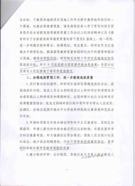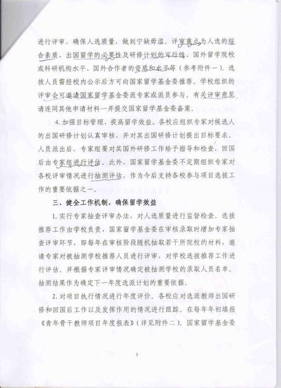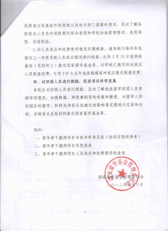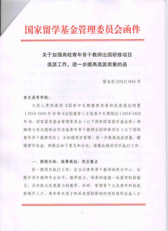 2、现将国家留学基金委管理委员会《关于加强高校青年教师出国研修项目选派工作,进一步提高选派质量的函》转发给你们,请认真领会精神,做好青年教师出国项目的选拔及回国后的留学效益评估及跟踪工作。
