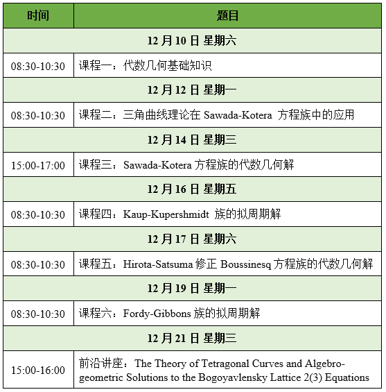 在本期系列课程中,我们将系统讲授可积系统的代数曲线方法,内容主要介绍代数曲线基础知识,包括代数曲线的基本性质、紧致Riemann面、Riemann-Hurwitz公式、Baker-Akhiezer函数、三类Abelian微分、所诱导的Riemann theta函数的构造等。此外,课程将讲授代数曲线理论在可积系统中的应用,探讨可积系统诱导的三角曲线的性质,计算Baker-Akhiezer函数和亚纯函数的因子,介绍Abel映射和Abel-Jacobi坐标拉直对应的流,系统给出与3×3矩阵谱问题相联系的可积非线性演化方程的代数几何拟周期解。针对三角曲线的不同情形,详细讲解求解方法和过程。本期讲习班活动分为六次课程(每次两个小时)和一个前沿学术讲座。