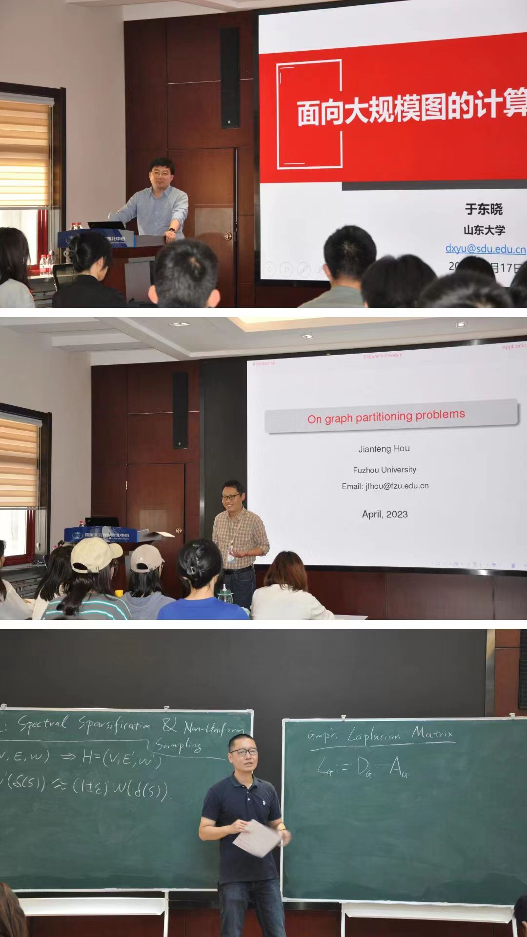 成功举办了“图计算讲习班”。该讲习班是“图论与复杂网络”主题年重要活动之一,邀请到福州大学侯建锋教授、山东大学于东晓教授、福州大学周宏副教授分别讲授“图划分理论、算法及应用”、“面向大规模图的计算与分析”和“图稀疏化和谱稀疏化”三门课程。共有来自上海交通大学、上海大学、山东大学、东南大学、新疆大学、宁夏大学、青海师范大学等20余所高校的80余位学者参会。
