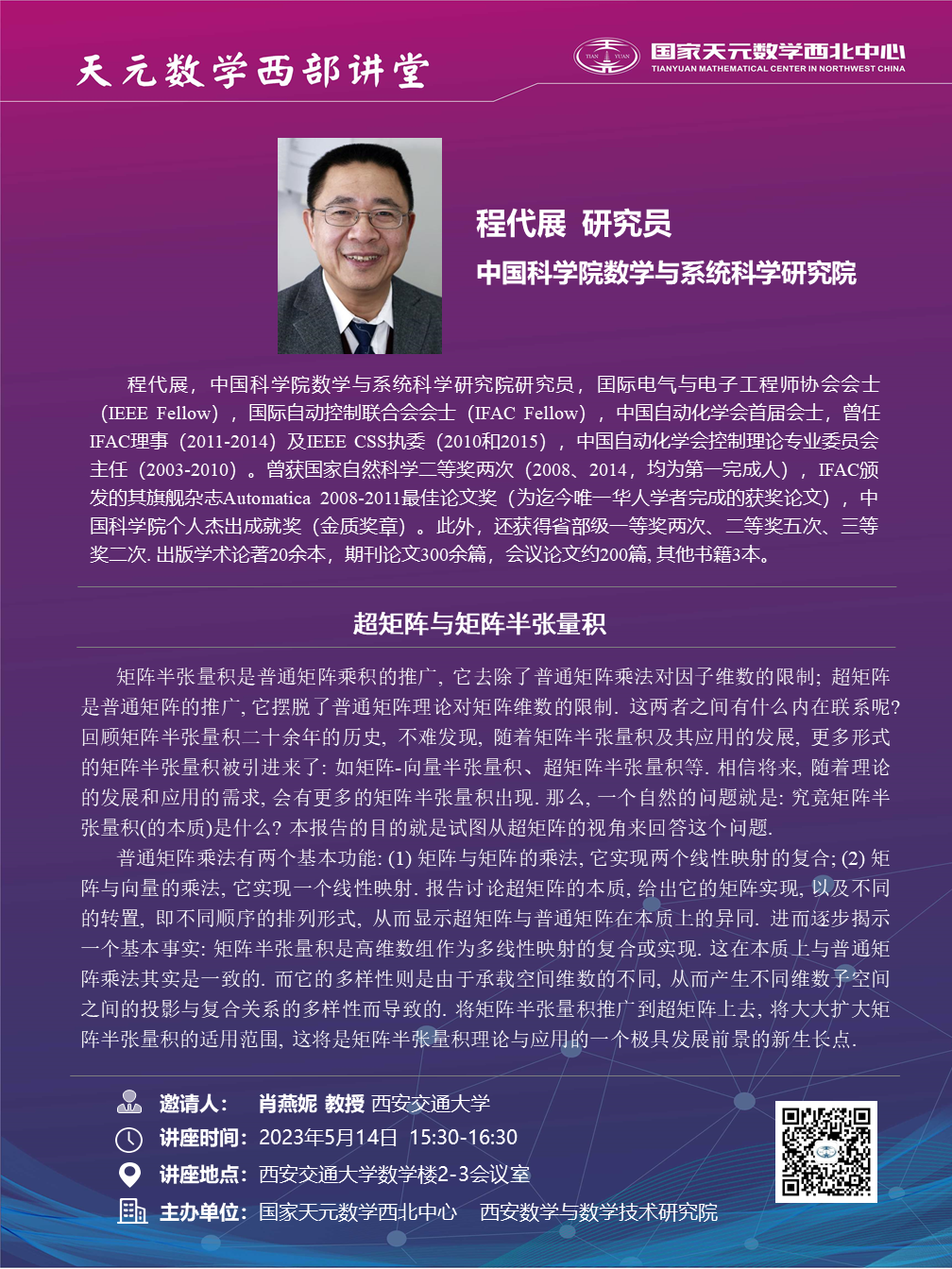 【天元数学西部讲堂】中国科学院数学与系统科学研究院程代展研究员学术报告