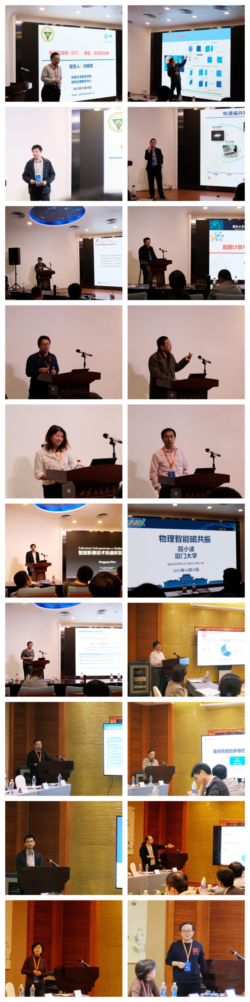 曾薇教授和与会专家共同主持。会议期间,与会专家聚焦医学成像与影像分析的数学理论与方法,讨论其在MR/CT/多模态医学成像与影像分析领域的应用,以促进数学反问题、人工智能、机器学习、物理成像等理论方法与医学影像应用间的交叉与融合。会议邀请了20位数学与医学影像领域的专家依次展开讲座报告:东南大学刘继军教授、电子科技大学尧德忠教授、电子科技大学李纯明教授、中科院深圳先进研究院梁栋研究员、香港中文大学金邦梯教授、清华大学高跃副教授、中科院数学与系统科学研究院陈冲副研究员、上海交通大学王利生教授、上海交通大学张小群教授、上海大学应时辉教授、上海科技大学沈定刚教授(联影智能联席CEO)、厦门大学屈小波教授(线上)、清华大学包承龙助理教授、中山大学姚正安教授、河南大学庞志峰教授、北京大学张立研究员、之江实验室林宏翔副研究员、爱爱啦