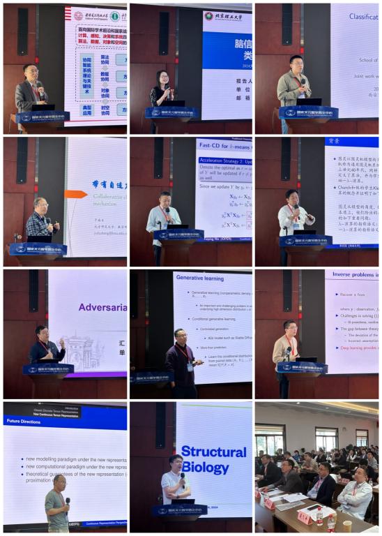 首先,国家级领军人才、西安电子科技大学协同智能系统教育部重点实验室主任公茂果教授介绍了在解决深度神经网络结构优化难题上的一些思路和尝试,及在深度神经网络应用上的一些新进展;国家杰青、天津大学北洋讲席教授,天津市机器学习重点实验室主任胡清华教授介绍了大规模超多类分类结构的层次关系分析最新的研究成果;北京理工大学邬霞教授介绍了面向脑信号分析的系列智能算法并分享受脑功能机制启发的类脑智能研究前沿进展;复旦大学石磊教授介绍了在建立有界和无界目标函数的统一泛化分析框架方面的最新进展;北京师范大学于福生教授介绍了针对多源数据的一种带有自适应机制的协作聚类方法;国家级人才、西北工业大学聂飞平教授在报告中介绍了一种快速的坐标下降法,并将其用于在求解聚类和特征选择任务中涉及的离散优化问题;湖南大学李庆国教授在报告中对Domain理论产生的背景以及四个重要的研究方向做了详尽的阐述;清华大学苏航研究员从对抗鲁棒的基本原理出发,介绍了基于对抗攻击的深度学习模型风险识别方法;武汉大学焦雨领教授介绍了各种深度生成模型的理论保证;清华大学包承龙研究员在报告中介绍了一种半监督噪声建模方法,利用配对和不配对的数据集来生成真实的降级数据;电子科技大学赵熙乐教授介绍了一种低秩张量函数表示,并探讨了张量函数秩和低秩张量函数分解;深圳医学科学院特聘研究员胡名旭博士介绍了近几年冷冻电镜图像处理方面的理论和算法研究成果,同时探讨了冷冻电子显微镜图像处理中的大数据分析挑战和进展。