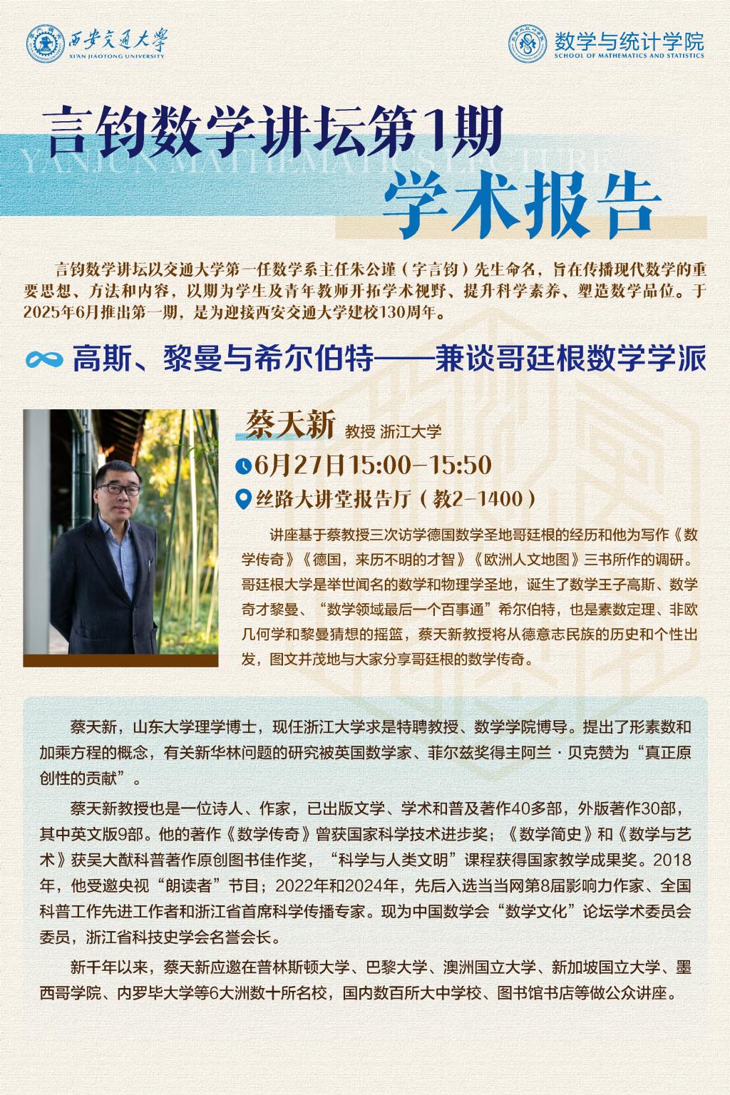 【言钧数学讲坛】浙江大学蔡天新教授、北京大学冯荣权教授学术报告通知
