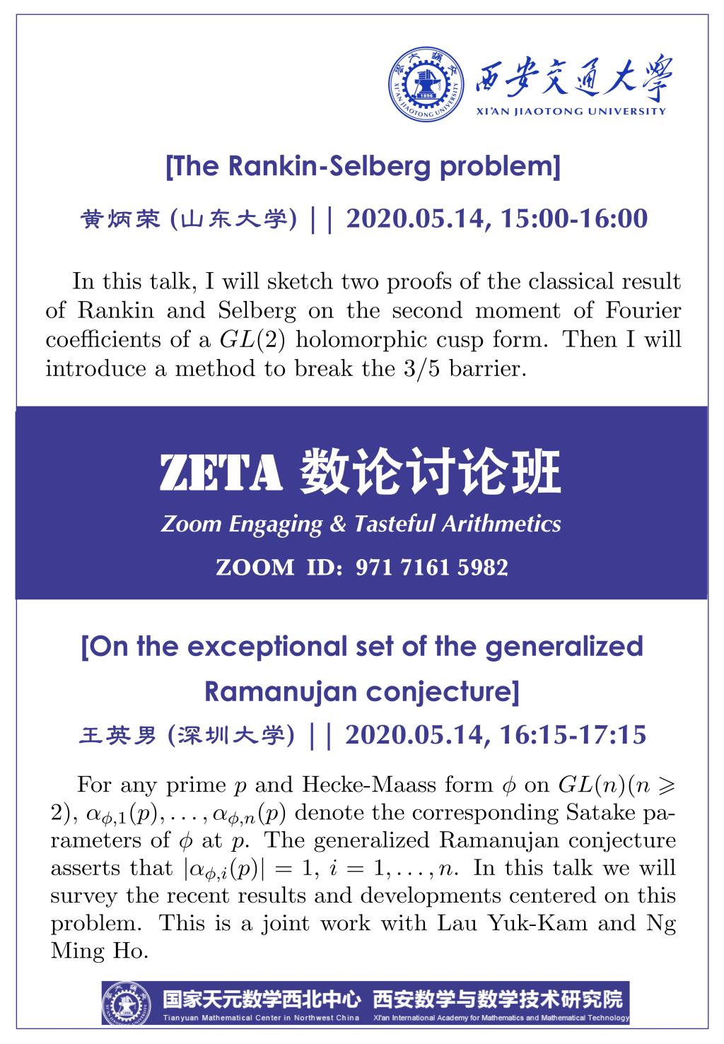 【ZETA数论讨论班】黄炳荣、王英男 (2020.05.14)