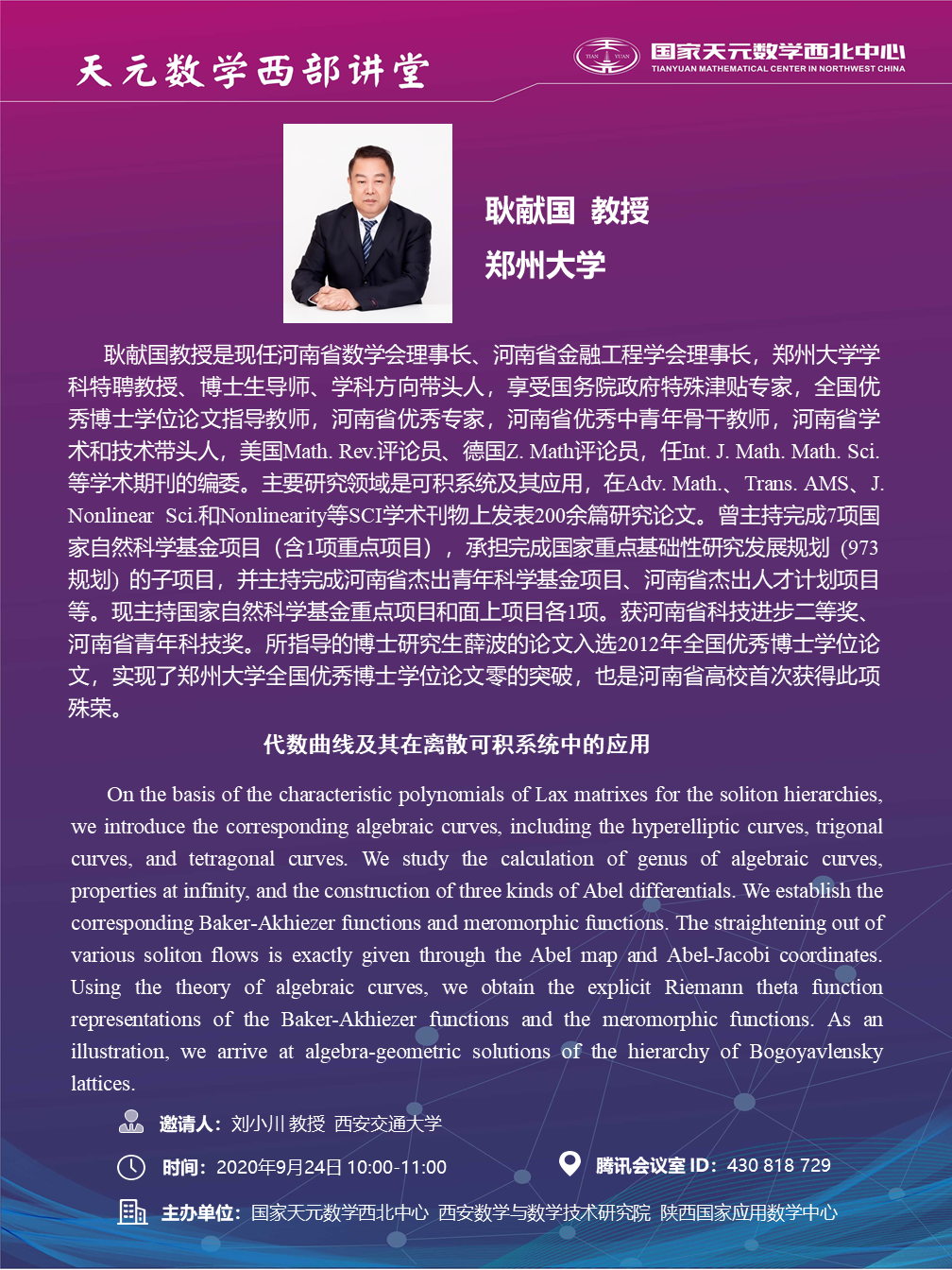 【天元数学西部讲堂】代数曲线及其在离散可积系统中的应用