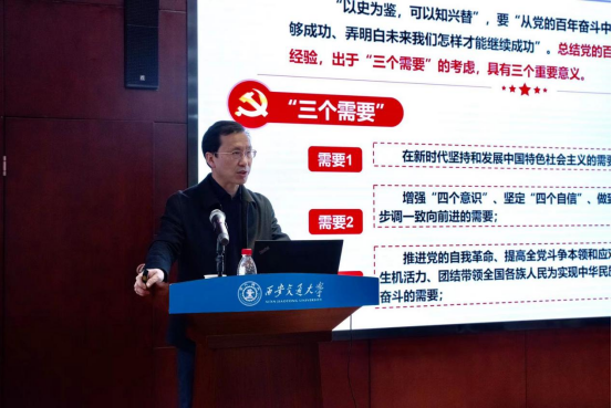 郑庆华副校长以学习贯彻党的十九届六中全会精神为主题,围绕深刻认识总结党的百年奋斗重大成就和历史经验的重大意义,深刻认识党的百年奋斗的初心使命和重大成就,深刻认识中国特色社会主义新时代的历史性成就和历史性变革,深刻认识党的百年奋斗的历史意义和历史经验,深刻认识以史为鉴、开创未来的重要要求等五个方面,对党的十九届六中全会精神进行了全面系统的解读。同时,郑庆华副校长系统解读了全国高校思想政治工作会议、全国教育大会、科技三会、中央人才工作会议中央讲话等关于教育、科技和人才工作的重要精神,并围绕西迁精神的核心、精髓和时代价值进行了深刻阐释。他表示,西迁精神正式入选中国共产党人精神谱系第一批伟大精神,其中所蕴含的爱国精神、奋斗精神、创新精神和奉献精神具有巨大的现实意义和时代价值。面对中华民族伟大复兴战略全局和世界百年未有之大变局,我们一定要心怀“国之大者”,把握大势,敢于担当,善于作为,把个人理想自觉融入到党和国家发展伟业中,为建设社会主义现代化强国贡献智慧和力量。