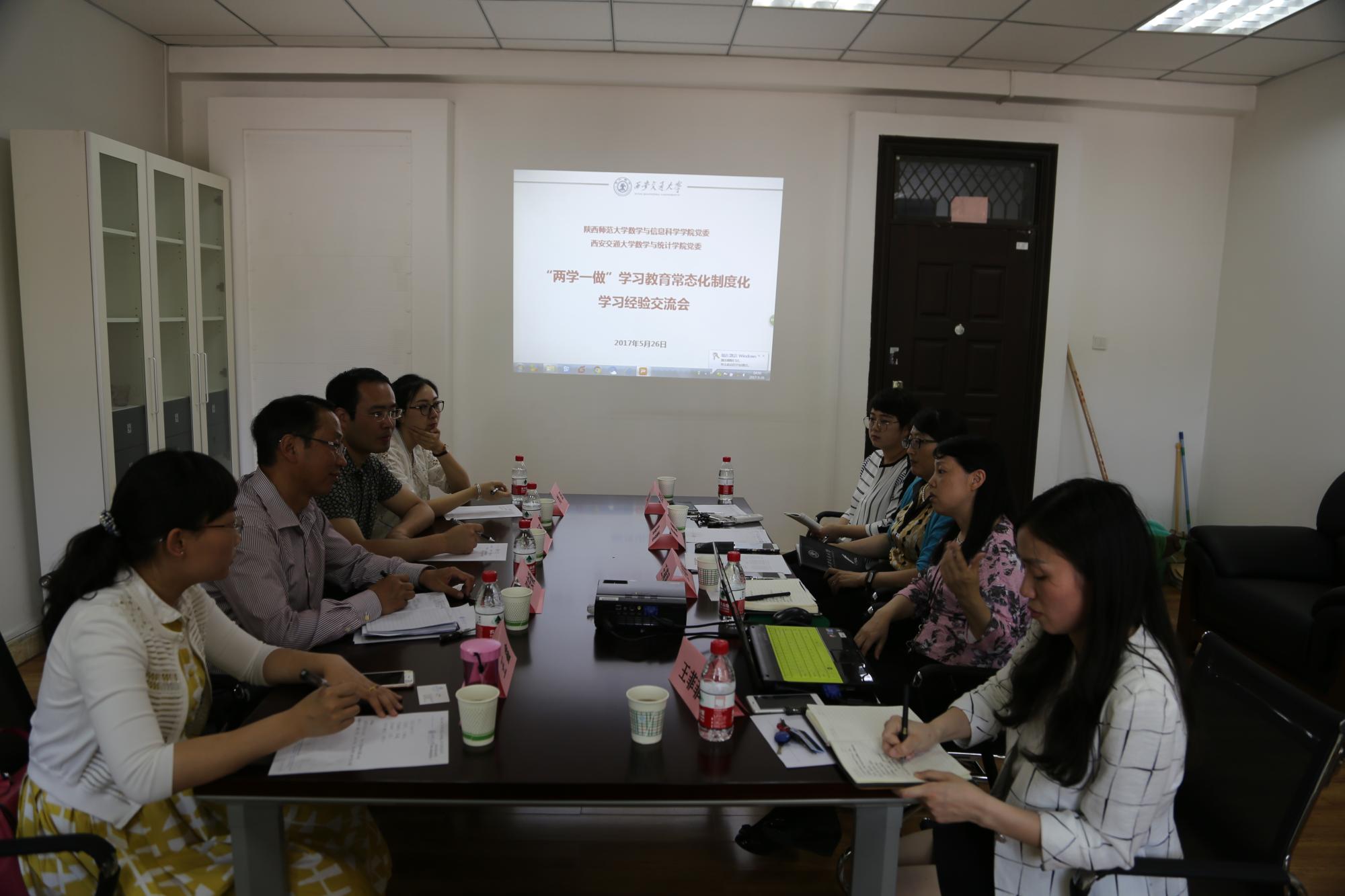 欢迎陕西师范大学同行的到来,并就我校“两学一做”学习教育常态化机制的相关要求和学院在“两学一做”学习教育中开展的工作情况进行详细介绍。双方聚焦如何提升教工党支部工作的积极性、完善“三会一课”制度、如何以党建为龙头祝好师德师风建设等问题展开深入讨论。易媛副书记以所在教工党支部为例介绍了学院教工党支部工作开展情况,包括鼓励年轻教师担任支部书记,建立支部传帮带机制、充分发挥年长教师对年轻教师的指导作用,关心和帮助支部成员成长和发展等。