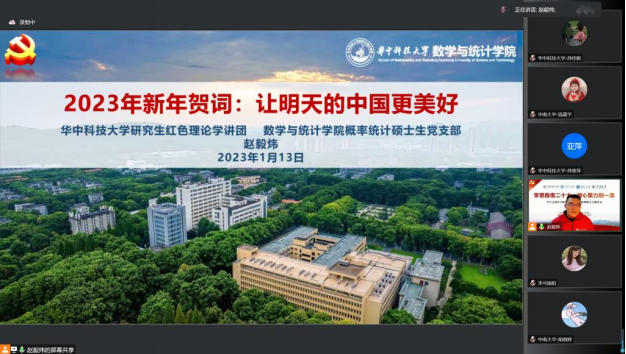 在“党课轮流讲”环节,华中科技大学研究生红色理论学讲团副团长赵毅炜以《让明天的中国更美好》为题,分“信心”“团结”“天下”“未来”四个维度领学习近平主席2023年新年贺词。他认为,展望明天的中国,必先回眸今天的中国;今天的中国,是明天的中国更美好的信心之源;展望充满希望的2023年,我们要以更加昂扬的姿态全面贯彻落实党的二十大精神。