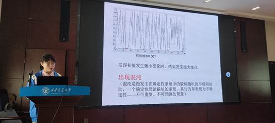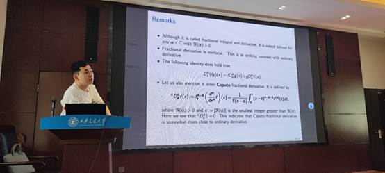 接着,缑天祥副教授为同学们带来题为“分数阶微积分”的学术报告,为同学们介绍了分数阶微积分的发展历史,定义以及相关性质。分数阶微积分作为数学的重要分支,几乎和经典微积分同时出现。近些年,分数阶微积分理论被广泛地应用到诸多领域中,刻画了自然科学以及工程应用领域中的一些非经典现象。